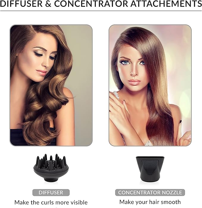 - DUAL STYLING OPTIONS – The hair dryer features a diffuser nozzle which is perfect for providing volume enhancing curls, and an adjustable concentrator nozzle which can be used alongside all hair types such as straight, curly, thin & thick.
